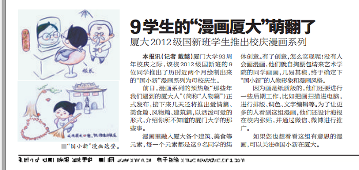 在厦门大学93周年校庆之际,来自厦门大学新闻传播学院2012级国际新闻班的本科生们,以班级微信为平台,共同推出了以“国小新看厦大”为主题的一系列创意漫画,旨在发掘校园里的人事风物,展现厦大人的爱校爱国情怀。漫画在各大社交平台上迅速引起了对厦大有深厚情感的师生共鸣,截至目前已超过一万的阅读量,并得到了《厦门日报》、《厦门晚报》、厦门网等主流媒体的关注与报道,成为厦大校庆的特色活动之一。