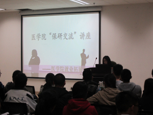 交流一开始,主持人先介绍了医学院2014届本科毕业生的优秀事迹,并简单阐述了医学院保研政策和相关要求,让同学们对保研有了初步的了解。