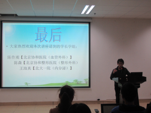 接着,三位优秀同学依次上台讲述自己的成功保研经验。保送北京协和医学院血管外科的陈作观同学热情洋溢地介绍了他走南闯北联系院校,一波三折的保研经历:英语六级低分飘过,科研经历几近没有,但他凭借自己丰富的学生工作经验和一种坚持不懈,愈挫愈勇的精神最终取得了这场马拉松式的保研历程的成功。保送北京协和医学院整形外科的陈森同学幽默诙谐,娓娓道来他作为一名“技术宅”的保研之道。凭借着清醒的认识、合理的定位、明确的目标,虽然一路磕磕绊绊,但是好事多磨,最终也顺利保研。最后,保送北京大学医学部附属第一医院内分泌科的王池真,用自己的努力诠释了什么叫做“机会偏爱有准备的头脑”,凭借着女生特有的缜密思维和细腻心思,她终于保送到了自己理想的城市、理想的学校和理想的专业。