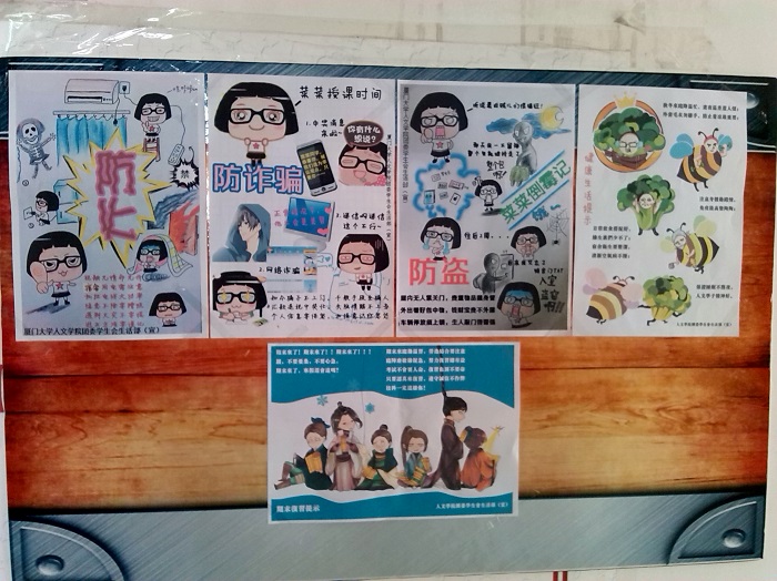 2013年12月中旬,筹备了近半个月的人文学院“让校园更美好”宿舍温馨提示板出现在了人文学院各宿舍园区。宿舍温馨提示板内容丰富,除了有学校学院活动通知外,更是别出心裁地贴上了由人文学院采编部干事、生活部干事原创的宣传漫画,内容多样,风格新颖。学院旨在通过这些生动漫画让更多同学了解必备常识并提高自我保护和防范意识,在校园中生活得更安全与舒适。