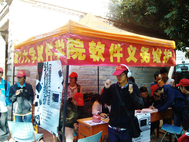 三十名热心的志愿者们分成接待组、宣传组和技术组三个小组,分工明确。宣传组在社区周围分发传单,热心引导前来维护和咨询的居民和老师们;接待组为前来咨询的人们讲解常见电脑问题、并记录下其具体地址联系方式和故障等信息;技术组则分为两个分队,一队留在大本营定点维修,二队则为不方便的老人和台式机用户提供上门服务。