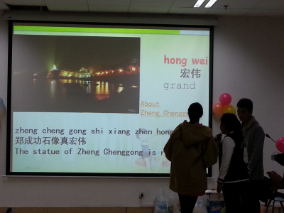 活动期间还穿插了互动与游戏环节,如语伴们上台互教中英文。当一名来自印度的男生流利地用中文说出“郑成功是一名民族英雄”时,全场同学都报以热烈的掌声,而这位男生也感到特别的兴奋,因为这是他第一次完整清晰地用中文表达。在随后的“背对背挤气球”、“抢板凳”及“兔子舞”游戏环节中,中外语伴们一起参与,这不仅让同学们感受到了游戏的快乐,更增进了彼此的友谊。紧接着,合着《最炫民族风》强有力的节奏,小伙伴们一同跳起了印度特有的舞步,极具新意,也将活动现场的气氛推向了高潮。