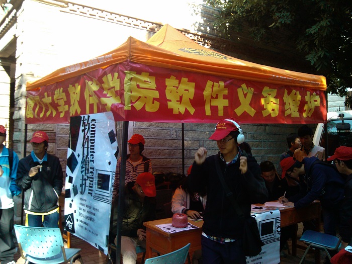 为了帮助厦大教师特别是退休老教师解决电脑使用过程中出现的一些疑难问题,11月30日上午厦门大学软件学社联合软件学院各党支部及电脑协会在敬贤凌峰园区内的南强书苑前开展了“让厦大更美好,软件学子义务维护进社区”义务软件维护活动。这已是软件学子2013年第三次软件义务维护进社区活动。