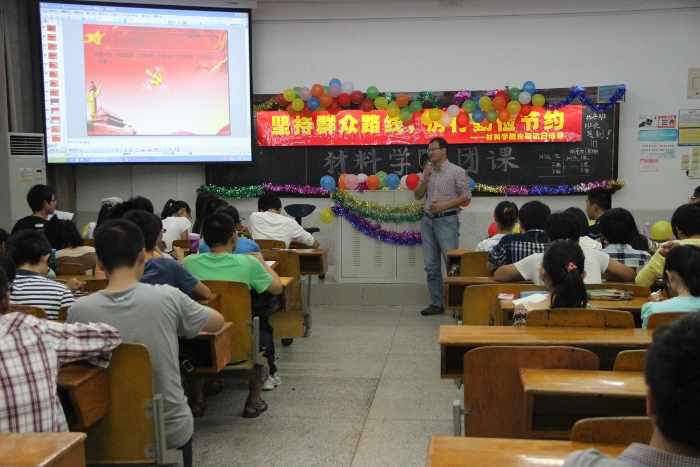 2013年11月15日晚19时30分,材料学院低年级本科生本学期首次主题团日活动在南强二502教室隆重举行。团课以“坚持群众路线,厉行勤俭节约”为主题,由2013级本科生兰晴和李蕙钊共同主持,以视频、游戏、知识竞赛等形式,深化了同学们对群众路线和勤俭节约等国家政策的了解。整场团课气氛活泼热烈。党委副书记杜海林、辅导员曹亮、兼职辅导员李晓杰到场观看,2012级、2013级全体本科生参与此次团课。