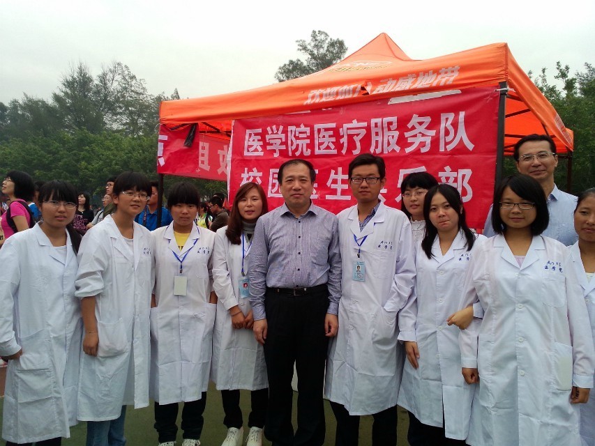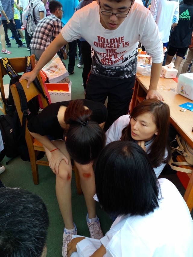 朴素的白大褂,整齐的医疗护理台,完备的医疗用品构成了运动场上一道别样的风景。校运会期间,医学院的志愿者们行走在运动场的四周,密切关注着每一位运动员的状况,及时地为前来诊治的每位受伤运动员进行诊查和治疗。据初步统计,校运会期间,医疗服务站共为全校各单位50余名师生提供了医疗援助服务,专业的技术、热情的态度,受到广大师生的一致好评。