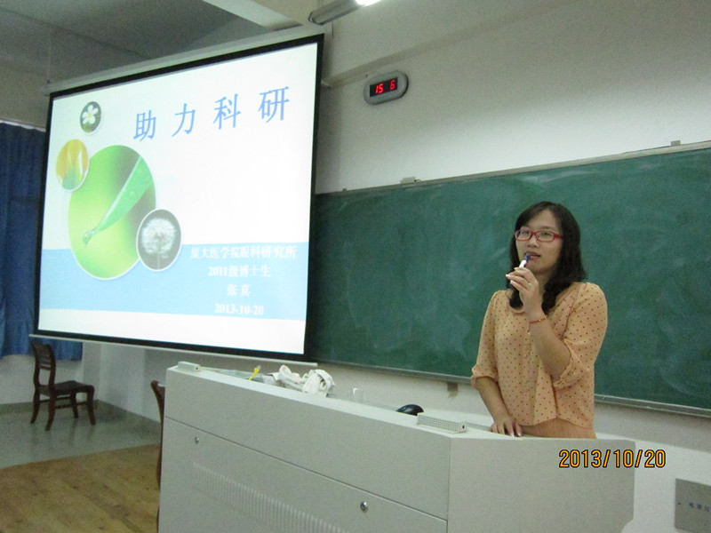 张真同学以“助力科研”为题,从“什么叫SCI”谈起,和与会的同学们畅谈如何规划自己三年的研究生生活。她从科研选题、查找资料、查看科研文献、课题开题等一系列问题说起,科研的步骤,系统地为同学们介绍了开展科研的方法、步骤,并提供了查看文献的相关网站,处理实验数据的常用软件以及其他同学们还不熟知的科研资源,还为大家普及了不少科学名词。张真同学认为,研究生生涯收获的不仅仅是“鱼”,更应该是“渔网”,掌握正确的科研方法和科研思路,是研究生期间的一个重要任务。