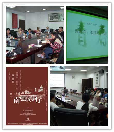5月11日晚7点,第5期南强议事厅硕博沙龙在新闻楼会议室举行。来自不同学院的硕士、博士汇聚一堂,围绕“致青春:谁绑架了你的人生”这一主题,从“理想的人生”、“屌丝文化”和“《致青春》电影评析”等三个子话题出发,展开了热烈的讨论。同学们认为,身为年轻人,认准自己的位置,为社会尽一份责任是最重要的;应该突破狭隘成功学的局限,实事求是地选择符合自身个性特长的人生道路,树立正确的择业观、价值观和人生观。