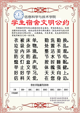 宿舍,是学生主要的学习、生活与交流的地方。宿舍文明和氛围对同学们的健康成长发挥着重要作用。鉴于此,信息学院一直都非常重视宿舍文明的建设。从卫生环境,到文明舍风,再到心理健康,信息学院把宿舍作为学生教育的起点和支点。文明宿舍评比、文明公约践行、文明舍风建设、健康心理培训等等,一系列针对宿舍文明建设的“起点行动”,从宿舍做起,从宿舍铺开;从宿舍长做起,从宿舍长铺开。班、团、院,你、我、他,由点到线,由线及面,集体将会变得更友爱、更团结。