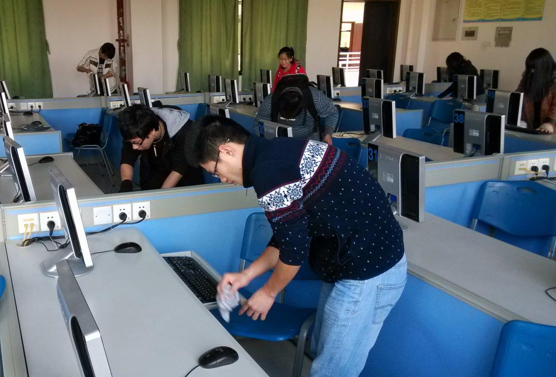 3月6日下午四点,在实验楼202、206教室窗外可以看到软件12级一班同学劳动的身影。他们有的蹲在地上,有的坐在椅子上,有的直接弯着腰。但是,都表情专注的擦拭着键盘上每一个角落。有些键盘因为太久没有清理过,里面塞满了碎物,表面的污渍明显可见。但是经过全班同学的齐力合作,认真擦拭,键盘换然一身,抚摸上去,手感清爽,没有了平日里的油腻感。最后,大家又把显示器和桌椅也擦洗了一遍,这才满意的放下抹布。