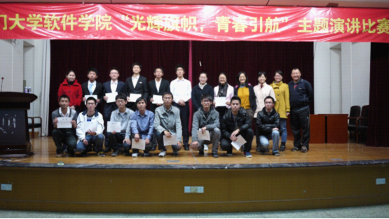 12月12日晚8点,软件学院在模拟法庭举办“光辉旗帜 青春引航”——为十八大献礼的主题演讲比赛。软件学院党委副书记刘钟南与全体辅导员老师一起出席了比赛。