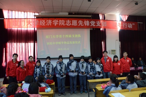 漫漫寒冬日,温暖送人心。为深入学习贯彻十八大精神,积极推进创先争优长效化建设,引领广大青年肩负担当社会责任,展现经院学子志愿先锋精神,经济学院志愿先锋党支部联合厦门大学第十四届研究生支教团于宁夏海原发起 “暖冬行动”,为偏远山区的孩子送去温暖。