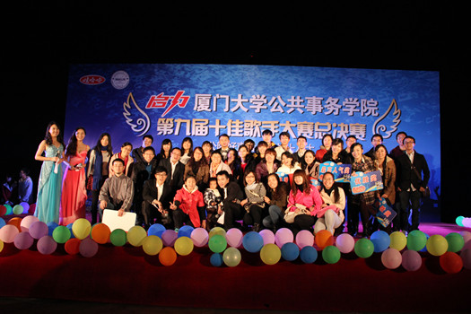 2012年12月8日晚7时,由厦门大学公共事务学院团委主办的“公院好声音,献礼十八大”公共事务学院第九届十佳歌手大赛决赛在芙蓉湖畔圆形广场隆重举行。本次比赛得到了学院领导的大力支持和悉心指导, 厦大监察处副处长陈东军老师、公共事务学院党委副书记黄新华、吴喜平老师亲临决赛现场指导工作。晚会盛情邀请到了艺术教育学院男高音歌唱家刘涛老师、海洋与地球学院党委副书记廖志丹老师、法学院团委书记高斌老师、公共卫生学院团委书记黄佳佳老师、公共事务学院团委书记杨玲老师担任评委。学院团委副书记蒋慧琼老师、辅导员谭超老师出席本次活动。