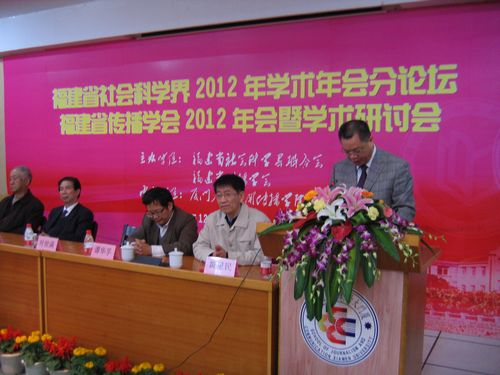 2012年12月8日,由福建省社会科学界联合会、福建省传播学会主办,厦门大学新闻传播学院承办的“福建省社会科学界2012年学术年会分论坛”,“福建省传播学会2012年会暨学术研讨会”在厦门大学人文学院报告厅隆重召开。福建省社会科学界联合会副主席谢孝荣、厦门大学副校长叶世满、福建省传播学会会长顔纯钧、厦门大学新闻传播学院党委书记邓朝晖等领导,以及来自省内传播学界的近百名专家学者共同出席。会议由新闻传播学院常务副院长黄星民主持。