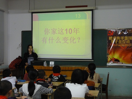 下午2点30分,厦门大学翔安校区学生办主任黄辉、海洋与地球学院党委副书记陈国强、廖志丹,团委书记吴珊珊等6位老师和20名学生红色宣讲团成员一起到达了宣讲活动的第一站——沙美小学。在校方的大力支持下,学生党员们为孩子们呈现了一堂精彩纷呈的主题宣讲会。胡锦涛总书记在中共十八大报告中指出,中国特色社会主义事业是面向未来的事业,需要一代又一代有志青年接续奋斗,要明志,要勤学,要知礼,要自强。同时,报告也明确指出“要提高海洋资源开发能力,坚决维护国家海洋权益,建设海洋强国。”宣讲会以此为主题,紧扣胡总书记的号召,一方面通过家喻户晓的中国传统故事和革命先烈的事迹,向孩子们讲述了“爱国、明志、勤学、知礼、自强”的深刻含义,启迪孩子们认知十年来家乡的变化,珍惜现在的幸福生活;另一方面,充分发挥海洋与地球学院的学科优势,生动介绍了十年来国家海洋事业的发展及未来趋势,鼓励同学们从小立志,为中华之崛起而读书,将来成为海洋强国的栋梁之材。正如沙美小学校长陈水杉所说,“孩子们应该从小接受这样的熏陶,在这次课程中,学生宣讲团以最亲近的姿态,最易懂的方式让孩子们感受了少年强则国强的要义。”