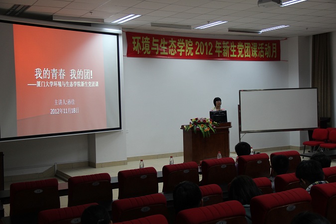 为深入学习宣传贯彻十八大精神,增强新生团员意识,11月18日晚,环境与生态学院在翔安校区环生楼B103会议室隆重召开了2012年新生党团课活动月的启动仪式,校团委副书记孙佳,环境与生态学院团委书记林明华,环境与生态学院本科生团总支、学生会全体学生干部和全院126名新生参加了仪式。仪式由本科生团总支书记黄欣怡同学主持。