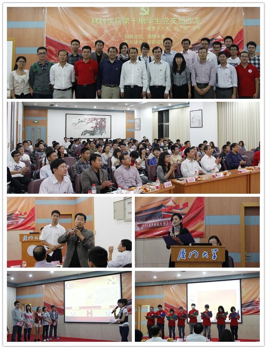 11月19日晚,材料学院全体学生党员团聚颂恩楼220会议室,以“感受十八大,我‘家’十年”为主题,回顾过往,憧憬未来,畅谈十六大以来的10年变化,探寻十八大精神源泉。校党委副书记林东伟,材料学院党委书记王康平、校党委学生工作部副部长郭锦星、校团委主持工作副书记陈怀锋、校党委学生工作部教育科科长陈泗林、经济学院团委书记马龙、翔安校区建设指挥部办公室洪海松、校党委组织部梁振伟以及兄弟学院辅导员代表、材料学院学工组全体成员出席了此次沙龙。