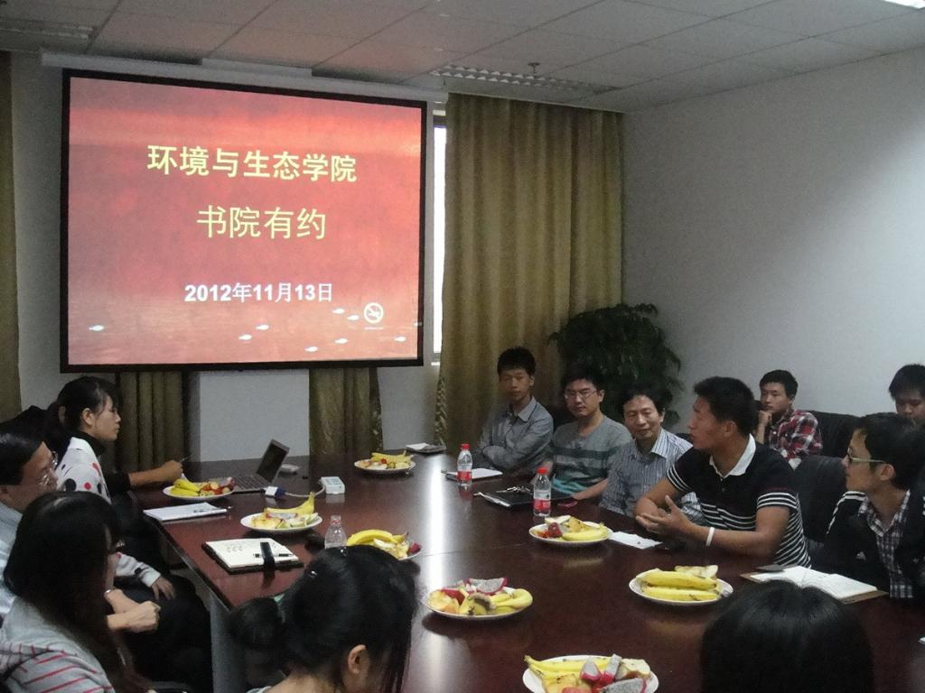 11月13日下午,环境与生态学院本学期第一期“书院有约”活动,在学院A220会议室拉开了序幕。院长李庆顺与十几位2011级、2012级研究生代表进行了一次气氛融洽、倾心真诚的交流,同学们对学院目前的实验科研、学术活动、国外交流项目和联合培养等问题提出了自己的看法和建议,李院长结合亲身经历、学院建设的规划和当前建设生态文明的重任等做出了有关解释和回应,同时也对同学们研究生时期的学术、科研和生活等谈了想法和希望。学院党委副书记周克夫、团委书记林明华、团委副书记黄建珍也出席了本次“有约”活动。