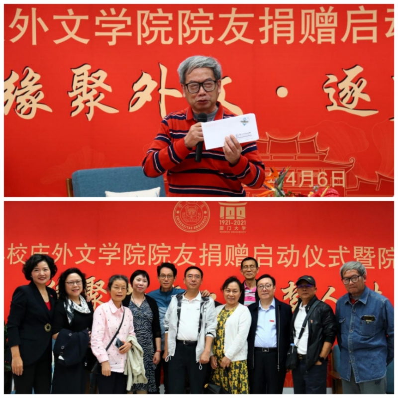 值此百年校庆的美好契机,五湖四海的院友再次缘聚外文。钟兴国、朱德贞的同学,同为77级院友的厦门大学郑启五教授为他们精心准备了一份意义非凡的礼物——贴着厦大百年校庆纪念邮票的外文学院信封,以此共同追忆昔日的厦园青春,出席沙龙的77级院友更是一同上台合影,留下了珍贵的记忆,在场的师生无不为之动容。沙龙最后,为感谢二位院友对学院多年以来的支持和关心,学院专门向他们送上了纪念品和鲜花。