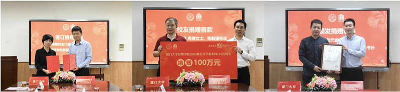 2003级会计学系本科155位校友向厦门大学捐赠100万元,在管理学院设立会计学系“林杉奖学金”。活动开始,赵医辉先生作为捐赠校友代表与厦门大学签订捐赠协议,与管理学院郑碧娇副书记合影。