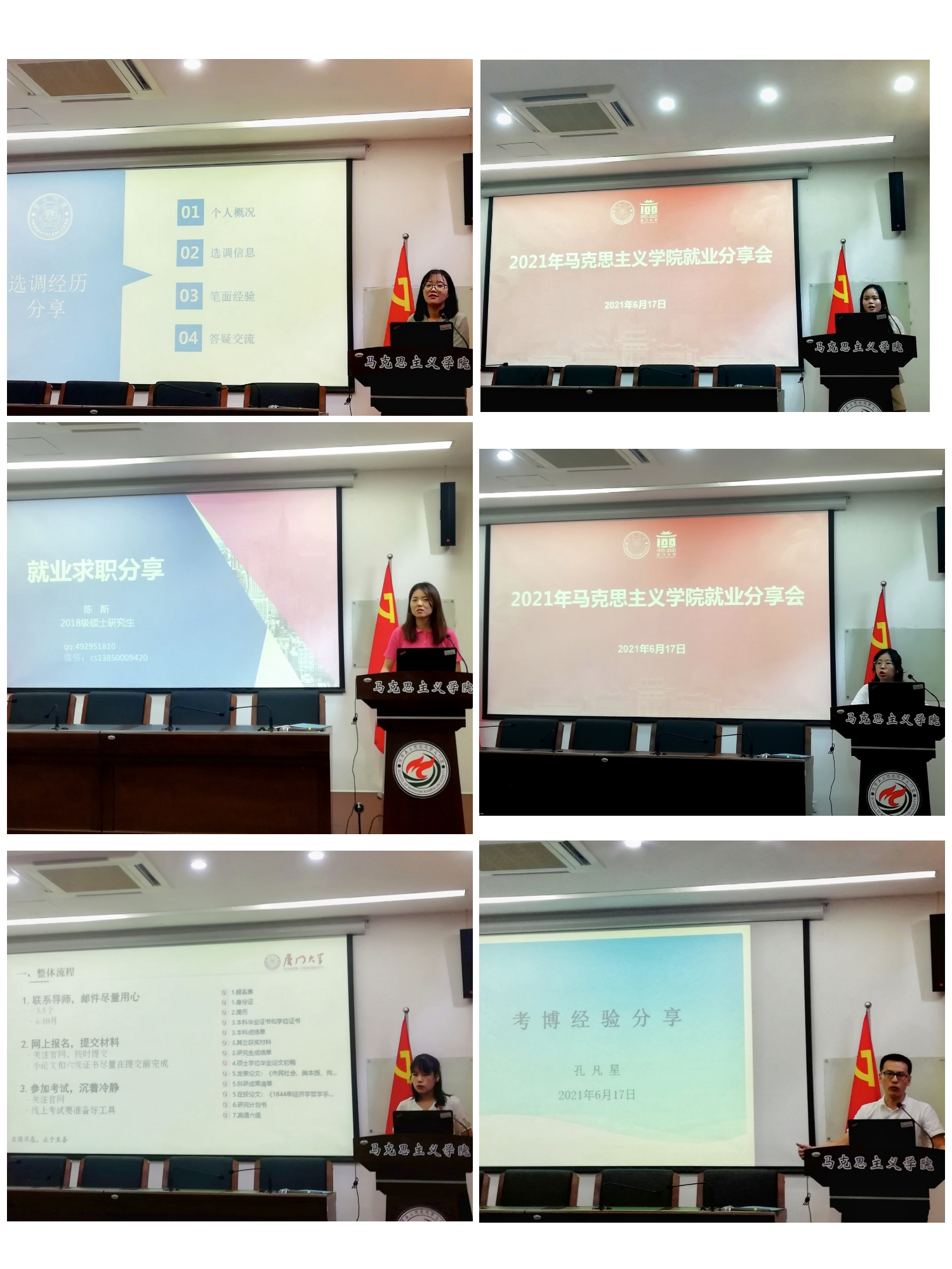 为充分发挥优秀毕业生榜样示范作用,激励引导广大学生树立正确的就业观,掌握学科就业技巧,2021年6月17日下午,马院在囊萤楼216报告厅举办了一场精彩的就业分享会,邀请2021届6位求职考博方面优秀毕业生作为主讲嘉宾,分享了他们在求职和升学的经验。分享会吸引学院70余名研究生参加,学院党委副书记杨建中、团委书记蔡虎堂参加分享会。