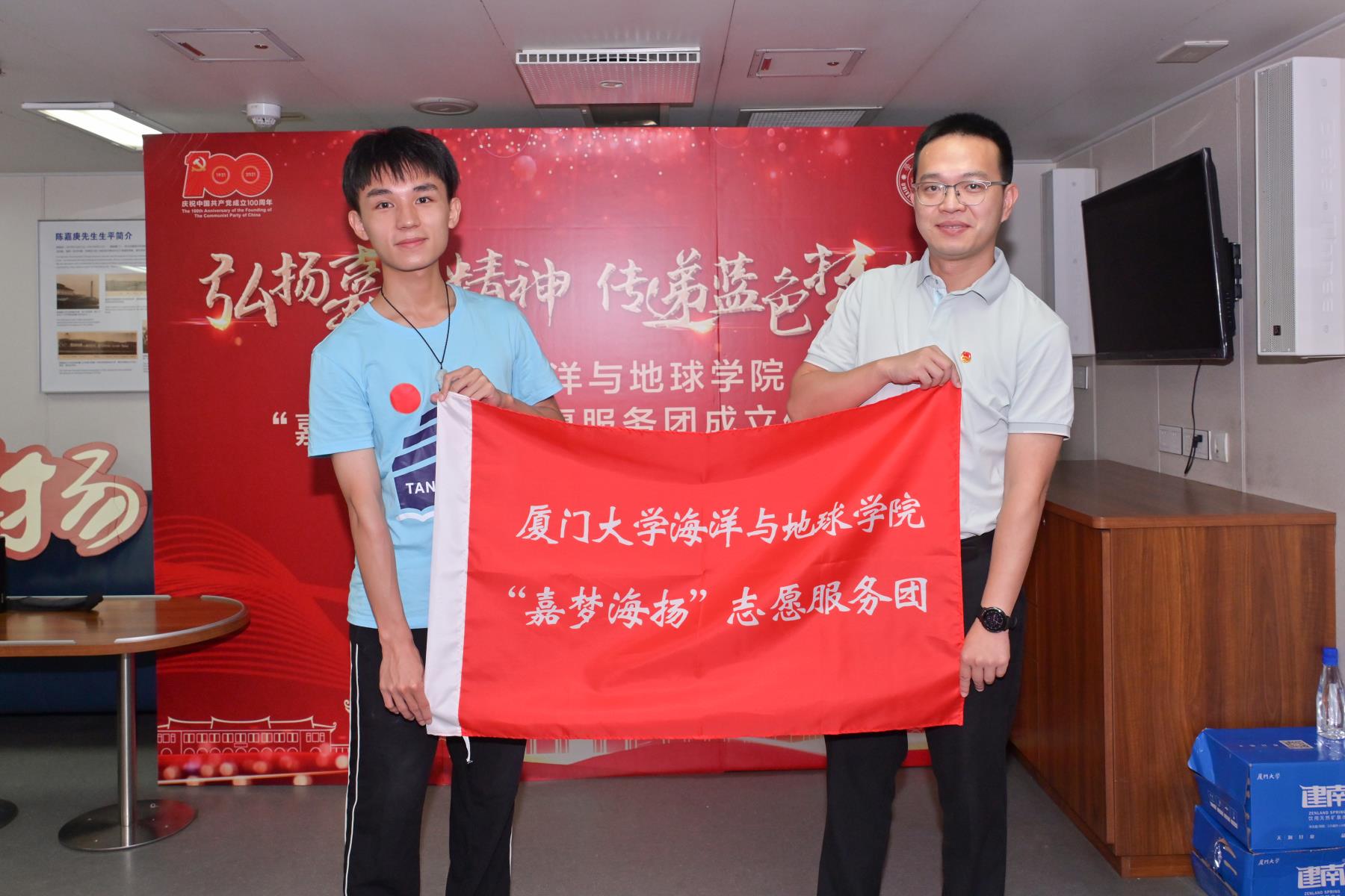 仪式上,厦门团市委组织部张云鹏部长为“嘉梦海扬”志愿服务团授旗, 张思鹏代表“嘉梦海扬”志愿服务团接过队旗,并简要介绍团队情况。“嘉梦海扬”志愿服务团是由厦门大学海洋与地球学院精心打造的、以弘扬“嘉庚精神”为宗旨、以传递“蓝色梦想”为使命的青年志愿服务团队。该志愿服务团由海洋与地球学院团委和科考船运行管理中心的老师共同指导,旨在传承和发扬发扬嘉庚先生毕生报国的爱国情怀、敢于担当的创新精神和无私奉献的优良品格,并致力于将“嘉庚精神”融入到普及海洋知识、传播海洋文化、提高海洋意识的行动中,融入到保护海洋生态、维护海洋权益、建设海洋强国的实践中,引导公众更好地关心海洋、认识海洋、经略海洋。