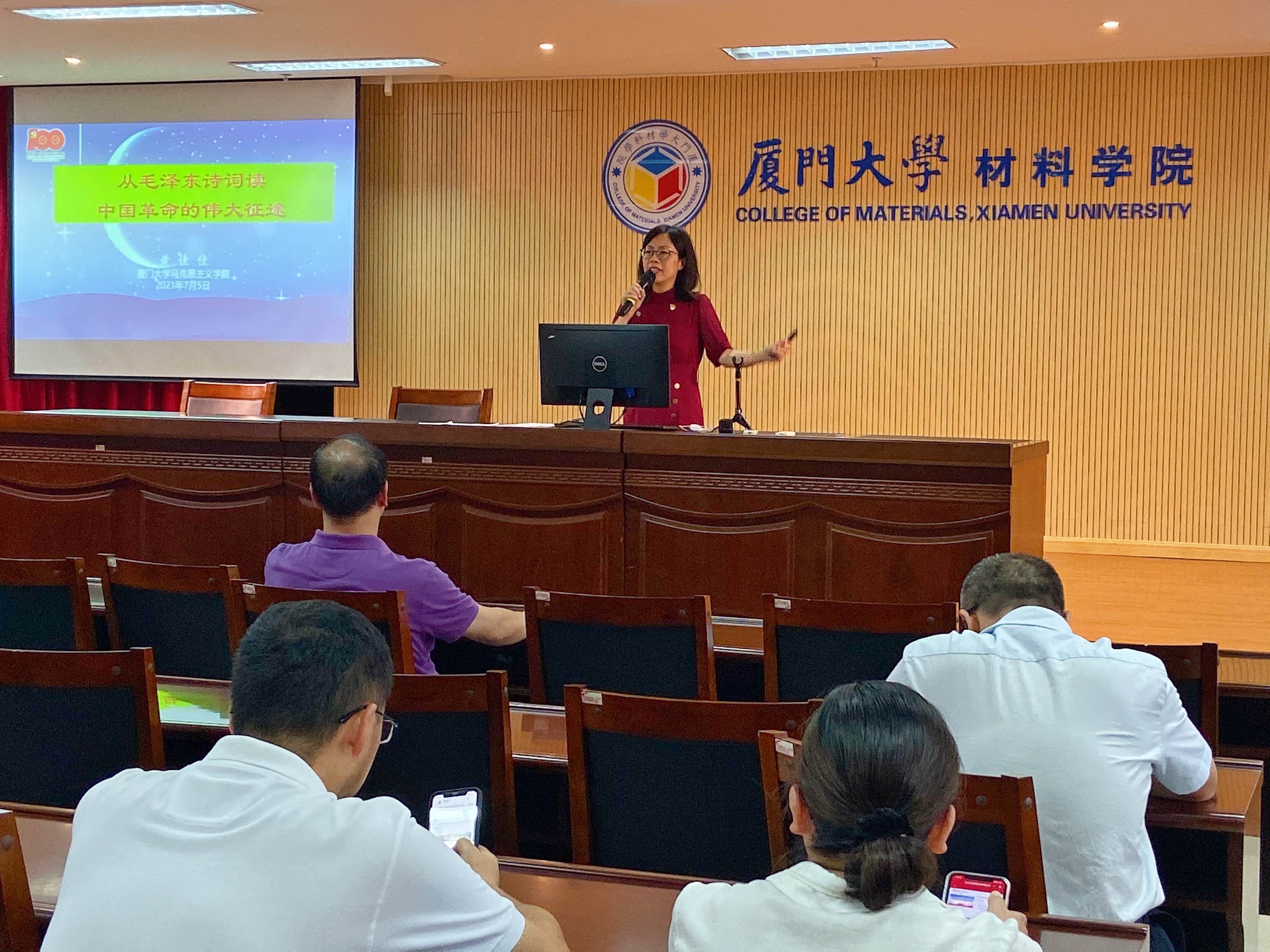为深入开展党史学习教育,为感悟伟人初心,传承革命精神,7月5日下午,马克思主义学院黄佳佳副教授应邀作题为《从毛泽东诗词读中国革命的伟大征途》的报告。材料学院党委书记刘立荣,党委副书记马兆海、黄兆君,副院长石巍等学院领导与全院师生党员共同参加讲座。