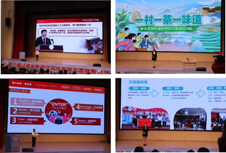 3月26日,第六届福建省新时代文明实践志愿服务项目大赛决赛在三明市委党校举行。大赛组委会通过评委初评、意见征求、媒体公示等环节,从226个项目中评选出75个优秀志愿服务项目,其中排名前45位的项目入围决赛。入围项目涉及理论政策宣讲、文化文艺服务、助学支教、医疗健身、科学普及、法律服务、卫生环保、扶贫帮困、助老助残、乡风文明等方面。在入围决赛的45个项目中,我校志愿服务项目获得1项金奖,3项银奖的优异成绩,获奖数量居全省高校第一。