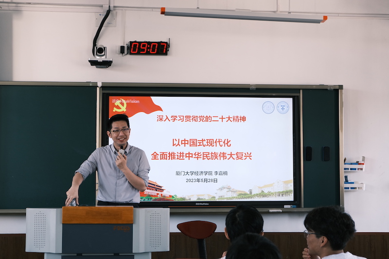 5月28日上午,团校举办理论学习专题讲座,邀请了经济学院李嘉楠副教授担任主讲嘉宾,进行“以中国式现代化全面推进中华民族伟大复兴——深入学习贯彻党的二十大精神”专题演讲。李嘉楠指出,党的二十大报告清晰阐述了未来五年的发展计划和执行方式,推进中华民族伟大复兴是最重要的任务,而中国式现代化是实现这个任务的理论框架和具体途径。随后,他进一步讲解中国式现代化的理论框架在实践工作中的重要性,强调了“续写马克思主义中国化时代化新篇章”中的“续”字,指出坚持和发展马克思主义,必须同中国具体实际、中华优秀传统文化相结合。最后,李嘉楠结合人类文明新形态与经济发展史,以一带一路建设为例,深入浅出地向同学们介绍西方资本主义发展的中心-外围理论,强调了人类命运共同体的重要性,指出中国式现代化必须由全国各族人民来创造完成。李嘉楠老师的讲座引发了在场同学们的广泛讨论,使同学们对党的二十大精神和中国式现代化有更深入的了解。