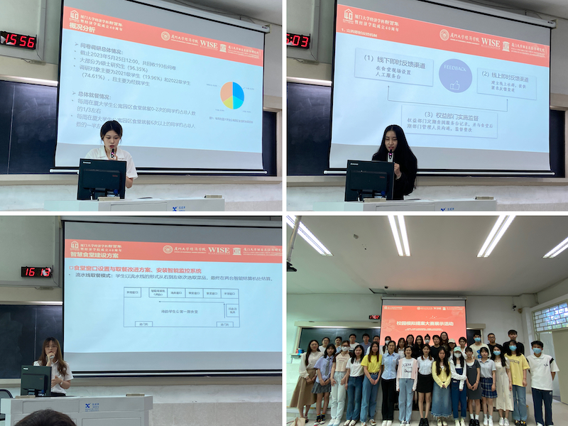 习近平总书记指出:“调查研究是谋事之基、成事之道,没有调查就没有发言权,没有调查就没有决策权。”为解决广大同学的切实需求,秉持“为同学办实事”的宗旨,推动调查研究走深走实,为学校建设发出青年之声,团校于5月28日下午举办校园模拟提案展示。团校小组合作完成关于提升厦大学生公寓园区食堂后勤服务的提案,成员们主动深入学院、班级、宿舍,通过个人访谈、问卷调查、实地走访等形式,倾听学生心声,了解学生所需,根据同学们对学生公寓园区食堂的建议形成了“完善监督反馈机制”的解决方案,并就“如何提升就餐满意度”提出智慧食堂建设方案、价格公开机制、提供健康套餐等优化措施。