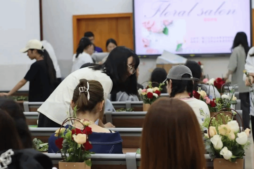 4月22日,公共事务学院举办主题为“繁花似锦,寻求心灵的宁静与自由”手工花艺心理沙龙活动,让同学们一起感受插花艺术的无限魅力。每位同学都认真创作自己的花篮,伴随着悦耳的音乐,进行一场心灵与花朵的交流。