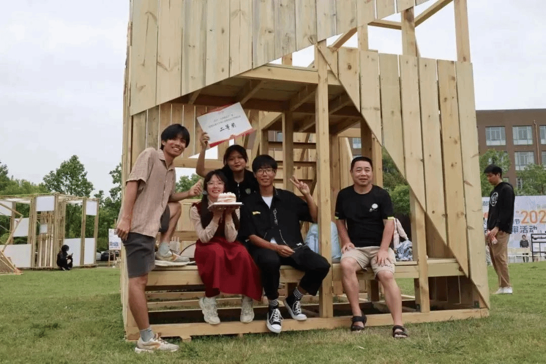 5月5日,2023两岸十校“天府建造节”暨西南交通大学第九届建造节在西南交通大学犀浦校区浙园湖畔举行。由林育欣老师带队,2020级本科生王祎铭、李泽清,2019级本科生施东波,2021级本科生张云帆、宋昕阳组成的团队,在本次赛事中团结协作、辛勤付出,以精彩的建构作品《峥嵘》夺得“天府建造节”二等奖,同时作为二十余个参赛作品中唯一具有极佳使用性的建筑而广受好评。