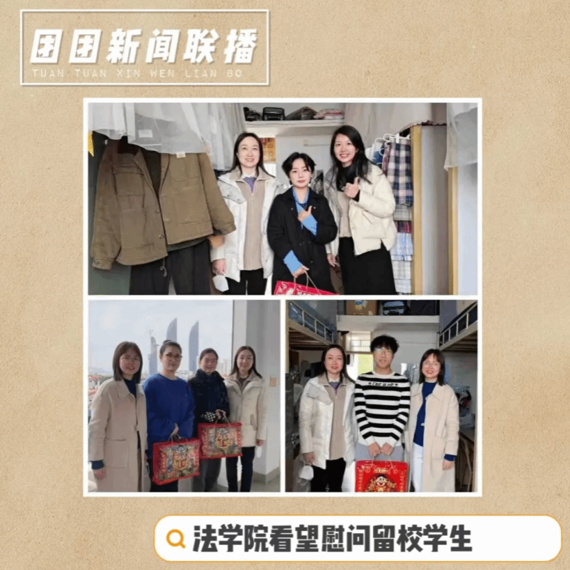 1月16日、17日,法学院学工组走访学生宿舍看望慰问留校同学,并为他们送去新春祝福与新年礼物。老师与同学们亲切交流,关心他们的身体状况,了解留校原因和假期计划,并承诺保障同学们的日常需求。