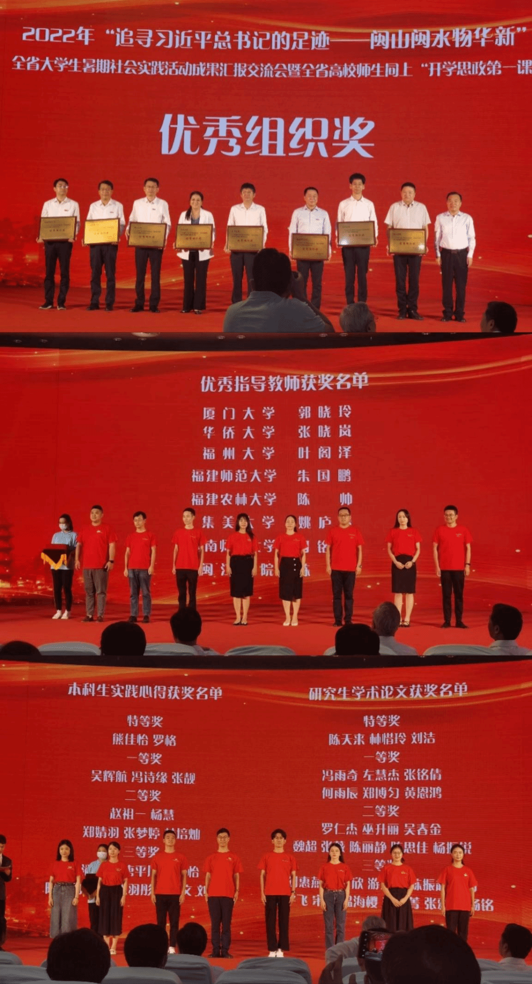 近日,团中央青年发展部发布2022 年“三下乡”社会实践优秀团队名单。其中,厦门大学“追寻习近平总书记的足迹——闽山闽水物华新”福建省大学生暑期社会实践队(南片)入选2022 年全国“三下乡”社会实践优秀团队名单,在全省大学生暑期社会实践活动成果汇报交流会中,实践队员陈天来、熊佳怡荣获“优秀实践成果特等奖”,指导老师郭晓玲荣获“优秀指导教师”称号。