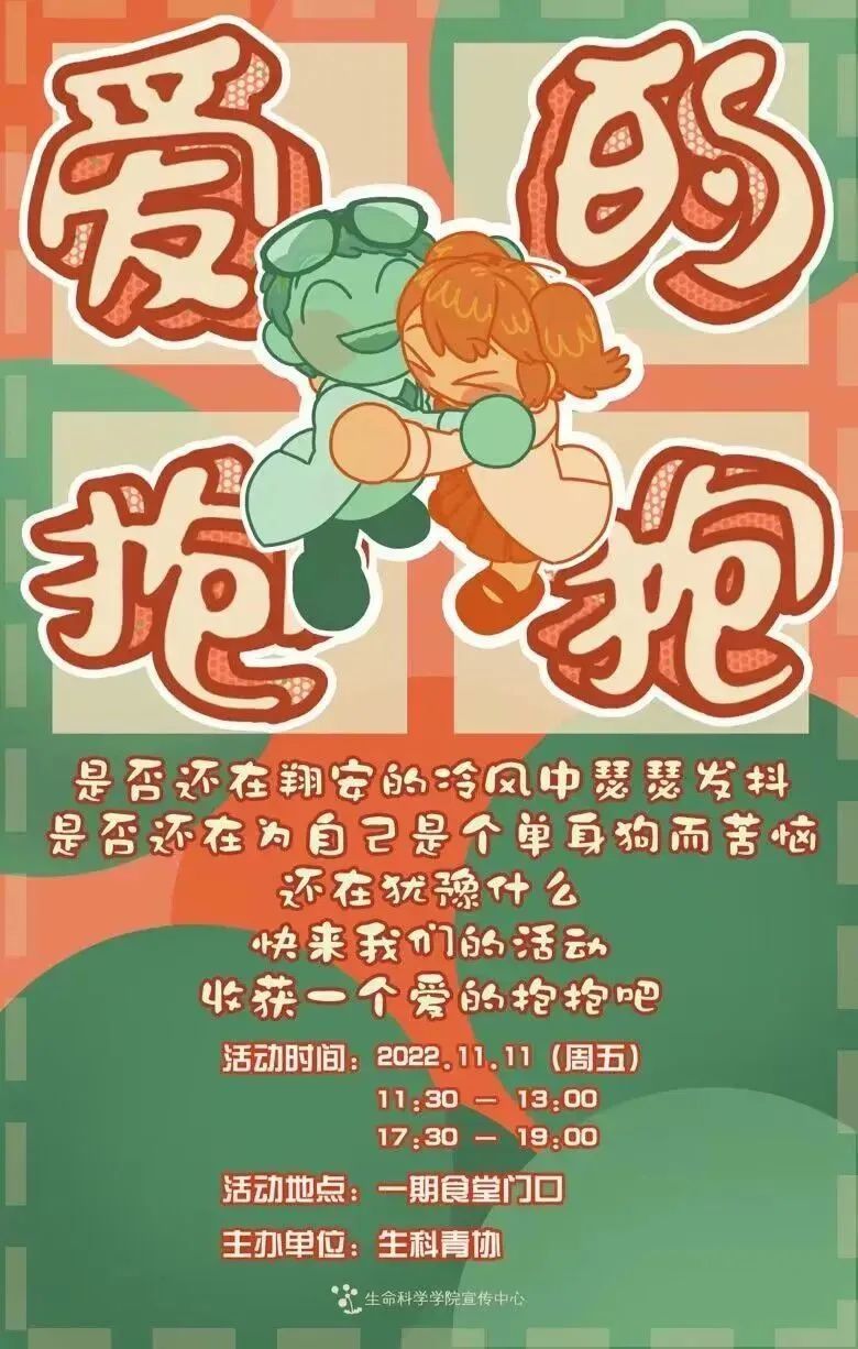 11月11日,生科青协专业抱抱团队在翔安校区一期食堂为来往的同学送去了爱的抱抱,跳舞熊,小熊维尼,大白,熊本熊,希望用一个短短的拥抱可以久久温暖冬日的你。