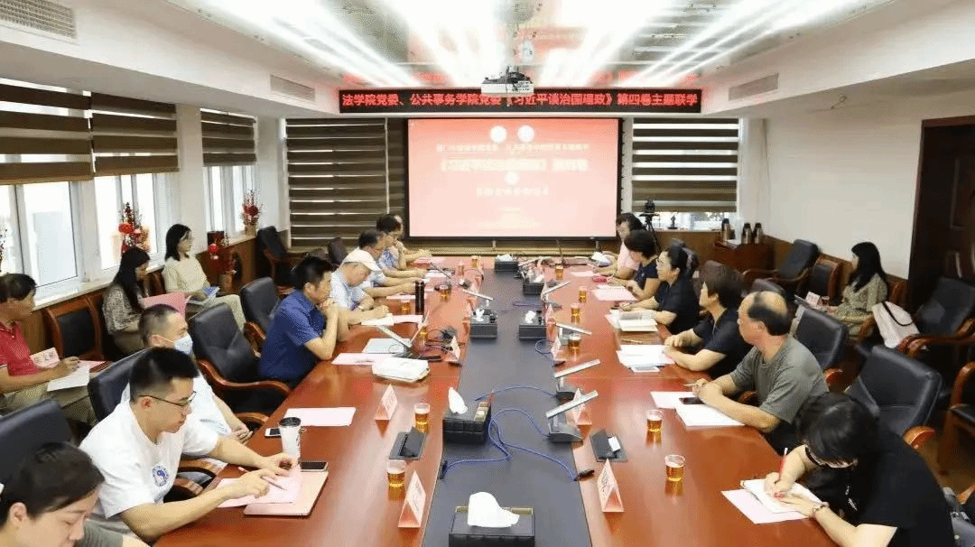 9月21日下午,法学院党委、公共事务学院党委在法学院B220会议室开展《习近平谈治国理政》第四卷之“坚持党的全面领导”主题联学活动。法学院党委书记许和山带领大家重点学习了《习近平谈治国理政》第四卷中的第二专题“坚持党的全面领导”,校党委组织部副部长曲延云作总结点评。希望各学院党委都能持之以恒强化理论武装,努力为学校“双一流”建设作出更多更大贡献。