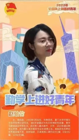 近日,共青团中央公布了2022年“全国向上向善好青年”名单,我校环境与生态学院2019级博士生赵蚰竹同学获得此荣誉称号。赵蚰竹四岁被确诊为先天性神经性耳聋,靠学习唇语适应学校生活。2019年进入厦门大学以来,她刻苦钻研,已发表核心期刊论文2篇,EI论文2篇,SCI论文3篇。