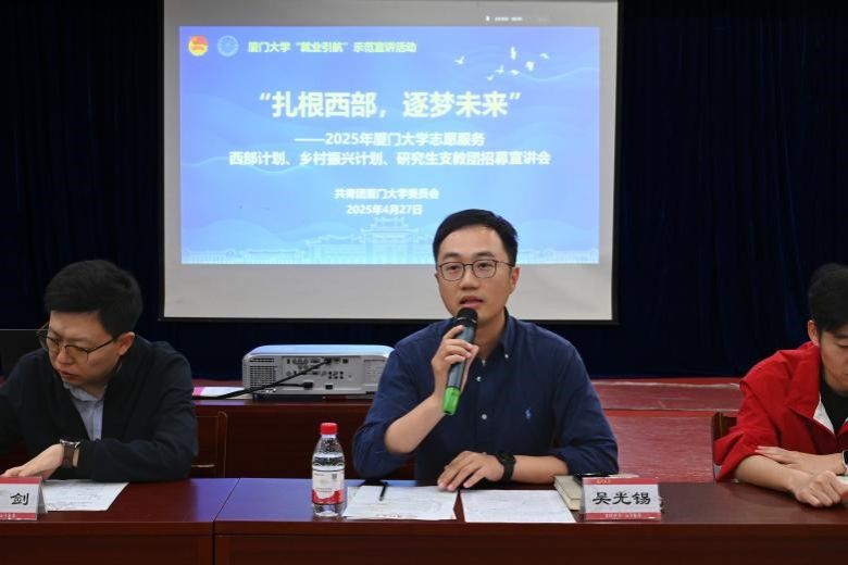4月27日下午,厦门大学团委举办2025年厦门大学“就业引航”示范宣讲活动,聚焦志愿服务西部计划、乡村振兴计划、研究生支教团召开招募宣讲会。新疆昌吉州团委副书记李剑、奇台县团委书记程建泽、校团委副书记吴光锡以及4位西部计划志愿者代表出席活动,现场约100位学生代表参加。