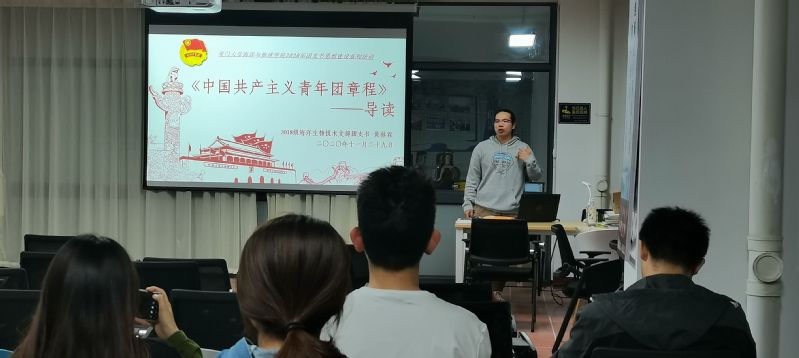 本次培训邀请到2018级海洋生物技术支部黄林霖和2017级海洋生物支部丁博两位优秀团支书解读《中国共产主义青年团章程》并分享工作经验。