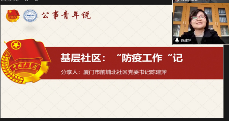 陈建萍书记从宣、查、克、服四个方面详细介绍了厦门市前埔北社区开展的一系列防疫工作,介绍了社区积极发动居民配合、志愿者参与,利用大数据平台进行疫情防控的相关经验,特别是社区网格员在其中发挥的重要作用。她强调,社区是疫情联防联控的第一线,也是外防输入、内防扩散最有效的防线;“发动群众是我们疫情防控工作的制胜法宝”,只有依靠人民群众共同参与疫情防控工作,才能够取得抗击疫情的最后胜利。陈书记的介绍,让全体师生感受到了在疫情防控过程中,社区发挥的关键性作用,也深深感谢那些在基层社区一线深入细致工作的工作人员。