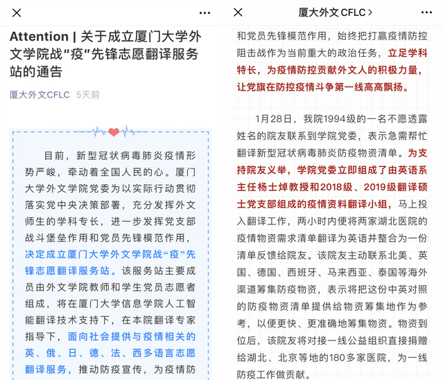 各学院教师的带领和指导下,青年团员更是充分发挥学科专长,服务防疫工作,推动防疫宣传。其中,外文学院组建战“疫”先锋志愿翻译服务站,面向社会提供与疫情相关的英、俄、日、德、法、西多语言志愿翻译服务,为抗疫工作贡献出自己的一份力量。
