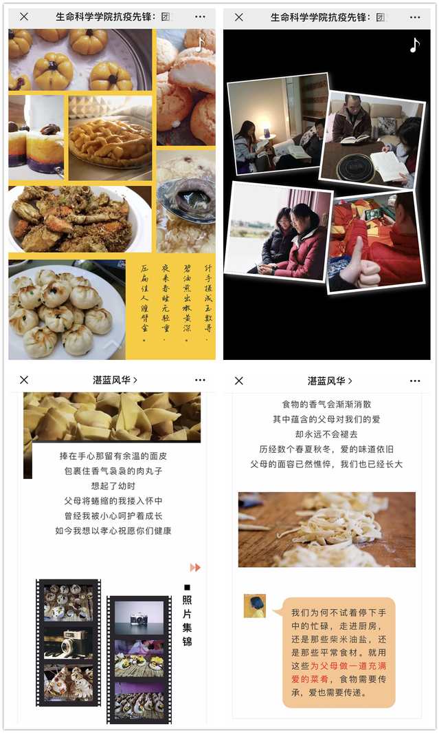 柴米油盐,孝心尽显。各基层团组织引导团员青年利用假期多多陪伴父母,为父母做一道菜,尽一份孝心、表达一份爱,并将自己的厨艺作品或烹饪过程通过照片或短视频等方式进行分享,更有学院通过评选优秀厨艺作品,展示团员青年的才艺和风采。