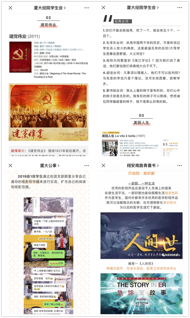 品一杯清茗,看一部好剧。各基层团组织积极向团员青年推荐知识性、思想性、艺术性强的优秀影视作品,引导广大团员青年积极观看、分享观后感,着力培育和践行社会主义核心价值体系,陶冶情操、增长知识。其中《人间世》、《建党大业》等影片多次上榜,广受好评。