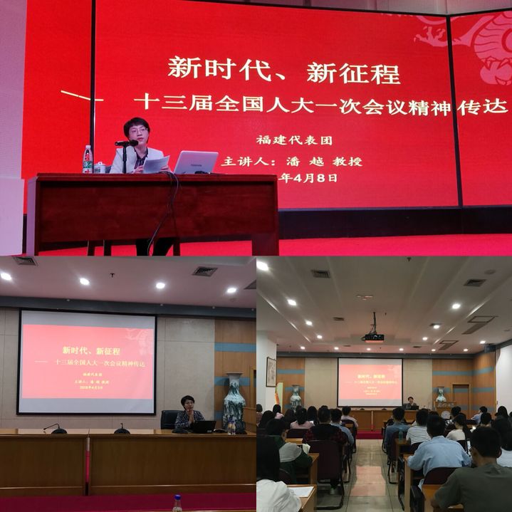 4月3日、8日晚,思明校区颂恩楼220会议室、翔安校区学生活动中心B207多功能厅内座无虚席、热情高涨。近200名学生骨干汇聚一堂,共同参加学习全国两会精神示范培训班。第十三届全国人大代表、厦门大学经济学院金融系潘越教授在两校区、分两场次,以“新时代、新征程,十三届全国人大一次会议精神传达”为主题,向来自学生马克思主义理论研修班、大学生骨干培养计划、“自强思源计划”学员,以及全校各学院、研究院学生党支部书记代表传达全国两会精神。报告会由党委学生工作部负责同志主持。