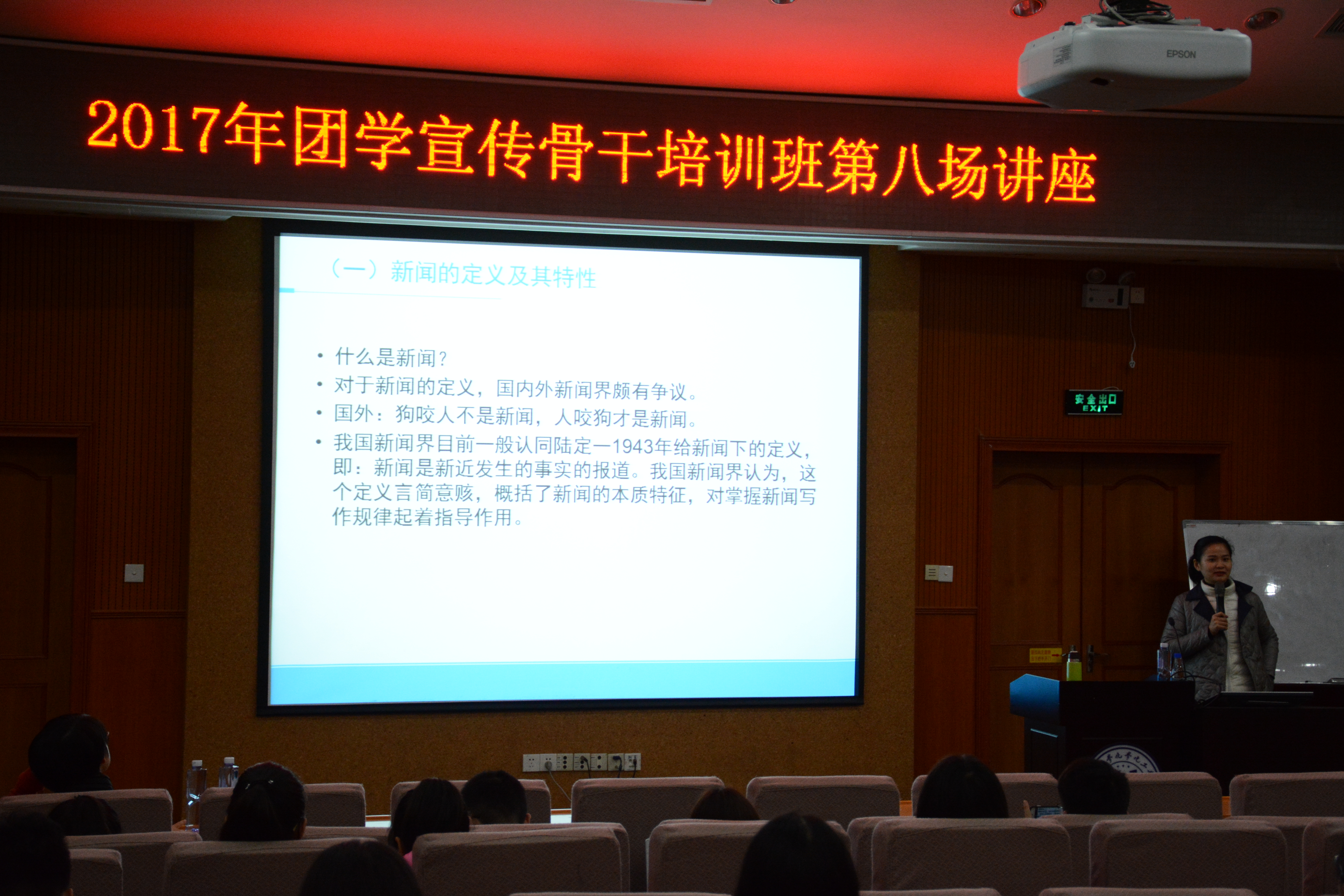 12月16日晚,2017年团学宣传骨干培训班第八讲在化学报告厅开讲。福建日报记者张静雯,以《新闻报道的注意事项——从这些年我追过的台风说起》为题,为同学们带来了一场精彩纷呈的讲座。讲座内容主要分为三个方面: