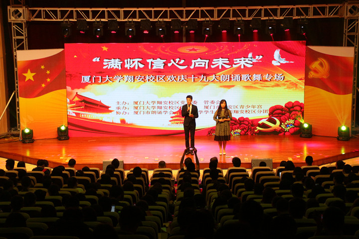 为热烈庆祝党的十九大胜利召开,宣传党的十九大精神和新思想,展示十八大以来祖国发展与建设的辉煌成就,展示美丽厦门建设取得的成就,10月31日19时30分,由厦门大学翔安校区党工委、管委会主办,厦门大学翔安校区团工委、翔安区青少年宫承办的“欢庆十九大诗歌朗诵会”在翔安校区图书馆大报告厅举行。校长助理、翔安校区党工委书记、管委会主任陈光,校区党工委副书记、管委会副主任高忠华、校区管委会机关部门负责人,校区学生党员,入党积极分子,第66期党校学员,2017级新生近600人参加活动。