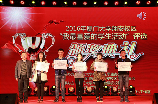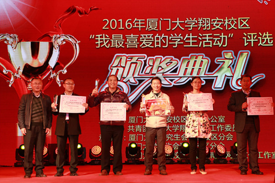 晚会现场还举办了2016年厦门大学翔安校区“我最喜爱的学生活动”颁奖典礼。为丰富翔安校区校园文化生活,进一步推动校园文化建设,营造和谐的校园文化氛围,翔安校区学生办、团工委举办2016年厦门大学翔安校区“我最喜爱的学生活动”评选。活动自启动受到了校区师生的广泛关注,校区各学院、各校级学生组织共推荐44项活动参与评选,网络投票(厦大师生)达到近3000人。活动采用“众评”形式,经过报名初审、网络投票、学生代表投票、老师代表投票等环节,最终诞生10个我最喜爱的学生活动(学院推荐活动与校级学生组织推荐活动各5个):中西医结合义诊(医学院)、无手机自习室 (航空航天学院)、假面舞会(环境与生态学院)、厦门大学第七届海洋知识竞赛(海洋与地球学院)、厦门大学“水灯节”活动(国际学院/海外教育学院),厦门大学翔安校区“身边的好同学”第三届优秀大学生评选活动 、厦门大学第四届风筝节、厦门大学翔安校区班级/实验室体育大比拼、厦门大学翔安校区首届“不服来战”街舞专场、厦门大学翔安校区第三届实验室风采大赛。高忠华老师为获奖学院、学生组织代表颁奖。