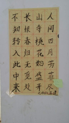 今年,我校在关桥中学支教的美术系学生殷征宇发挥专业所长,开设书法课。经过一个学期的学习,同学们通过不断的练习和反复的推敲,从不会握毛笔到能较为流畅的写出毛笔字,期间取得了较大的进步。