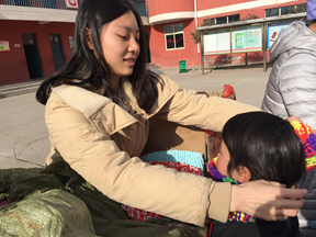 当天下午两点钟左右,所有准备工作都已就绪。支教团队员龚慧敏、黄莉怡、李心怡、刘常露和回民小学教务处主任谢老师、音乐老师单老师亲手为每一个学生系上爱心围巾,学生们脸上都洋溢着灿烂的笑容,在对老师们说完谢谢后有序的排队离开。