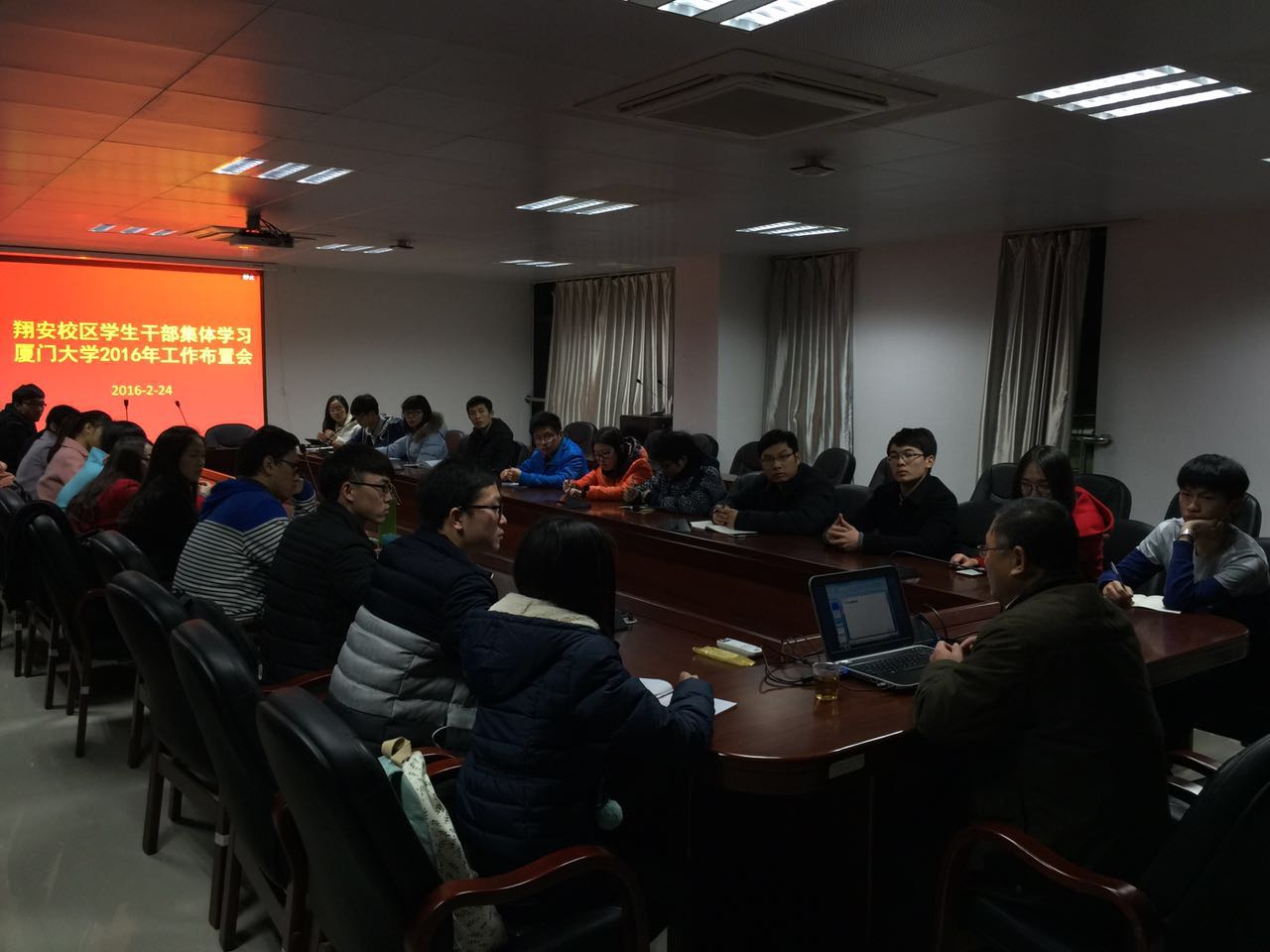 2016年2月24日,翔安校区主要学生干部集体学习厦门大学2016年工作布置会精神,翔安校区党工委副书记、管委会副主任高忠华老师传达学校2016年工作布置会的主要内容,和广大同学一起回顾学校2015年的工作总结,并学习2016年的工作要点。