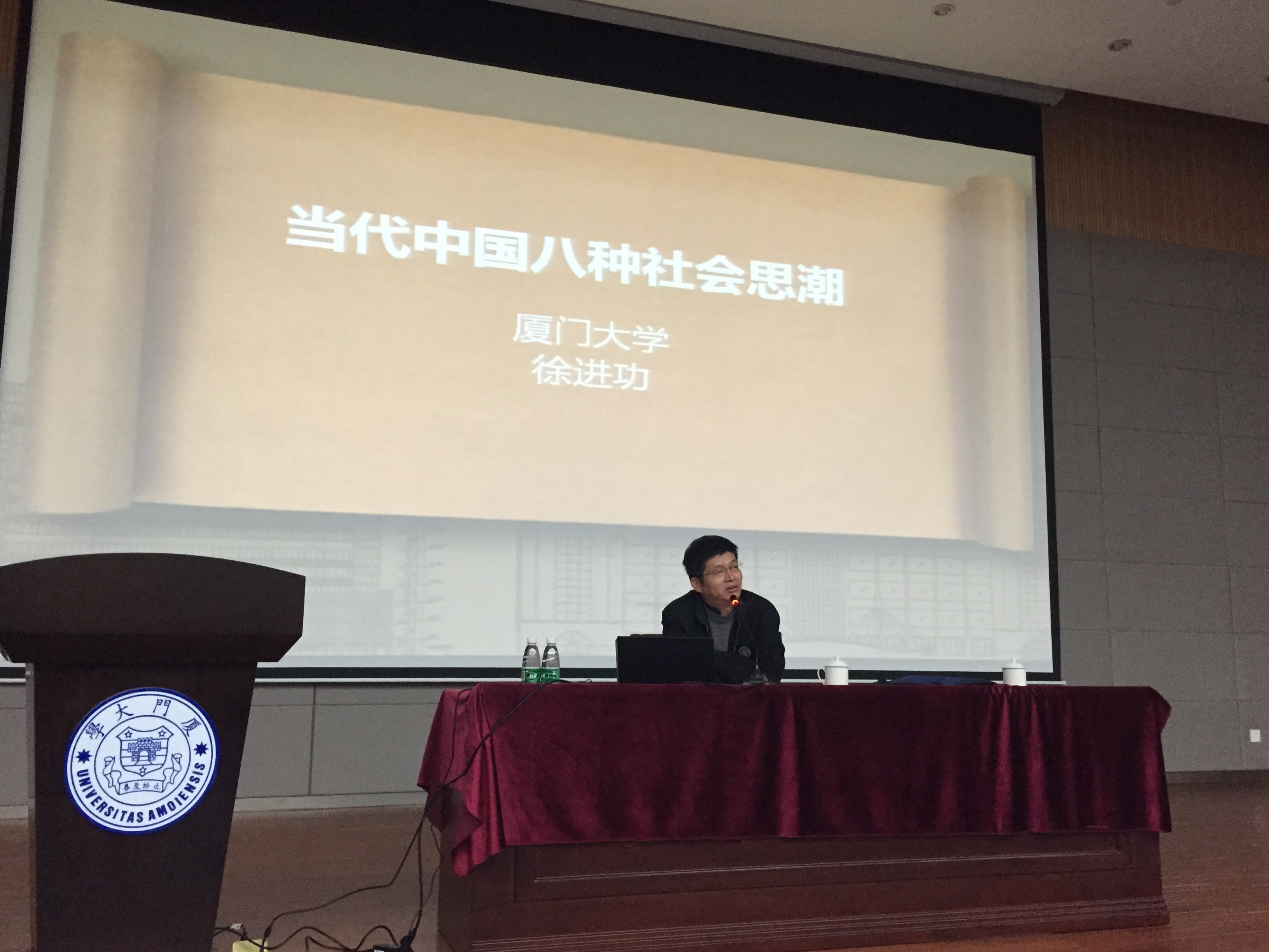 厦门大学党委宣传部部长徐进功教授为校区近三百名学生骨干带来本次培训班的第一讲——《当代中国八大社会思潮》。“改革开放以来,社会自由的初步扩展,为各种思潮面世提供了最低限度的宽容,使我们能够触摸到各种思潮大致的逻辑和边界。”对社会思潮的学习,有助于我们认识中国的过去和现在,也有助于我们探知中国的未来。徐教授对中国特色社会主义思想、老左派思潮、新左派思潮、自由主义思潮、民主社会主义思潮、民族主义思潮、新儒家思潮、民粹主义思潮等八种思潮进行了深入而生动的解读。期间徐教授旁征博引,妙语连珠,将自己的亲身经历穿插其中,将抽象的概念具化地阐释,将“大道理”转化为青年易于接受的“小道理”,令人叫绝,现场掌声此起彼伏。时近中午十二点,讲座进入尾声,同学们意犹未尽,纷纷表示受益匪浅。徐教授渊博的知识、幽默的讲解、自信的谈吐给同学们留下深刻印象,这场讲座亦启发了同学们理论学习的热情。